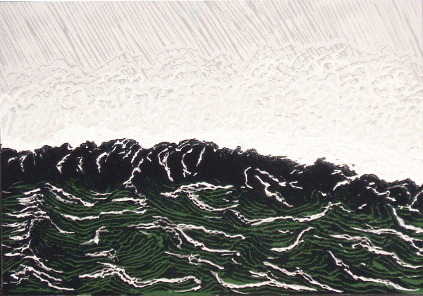 To establish the physical characteristics of this wave, I used data and formulas from a classic work on wave forecasting developed after World War II. Conditions chosen were: 50-knot wind, typical wave height 40 to 50 feet, typical wave length 700 feet, with a ratio of wave length to height of 15 to 1. The 3D paper model is constructed at a scale of 1= 300 or 1” = 25 feet. The linocut print image is based on the 3D model and augmented using written descriptions of actual wind conditions as well as reference photographs from the Beaufort Wind Scale. However, the linocut image does not exist in photographic form.