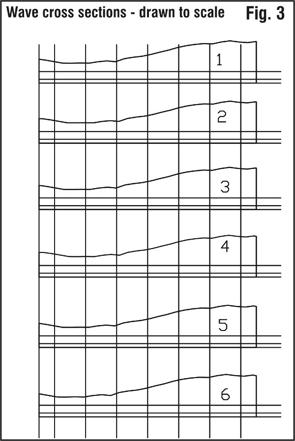 Creating the sequence of wave cross sections Using the principles of self similarity in nature I used a simple feedback function to create a sequence of cross sections of the original wave shape (fig. 1) at different relative scales. I used 3D CAD software to draw a 3D computer model of the wave (fig. 2) and chose an area of this 3D computer model for the paper model. I printed the thirty-two individual cross sections and modified them, by hand, to produce the slight alterations that actual wind conditions would produce (fig. 3). I then used a saw to cut the sections out of the paper and assemble the model. The result: 32 cross sections, in sequence, form a three dimensional representation of the wave.